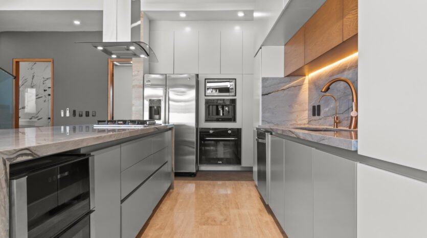 - Garbage disposal, built-in coffee machine, wine cooler, and filtered drinking water system