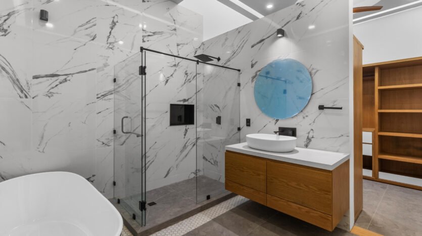 - Travertine marble finishes throughout various areas of the home