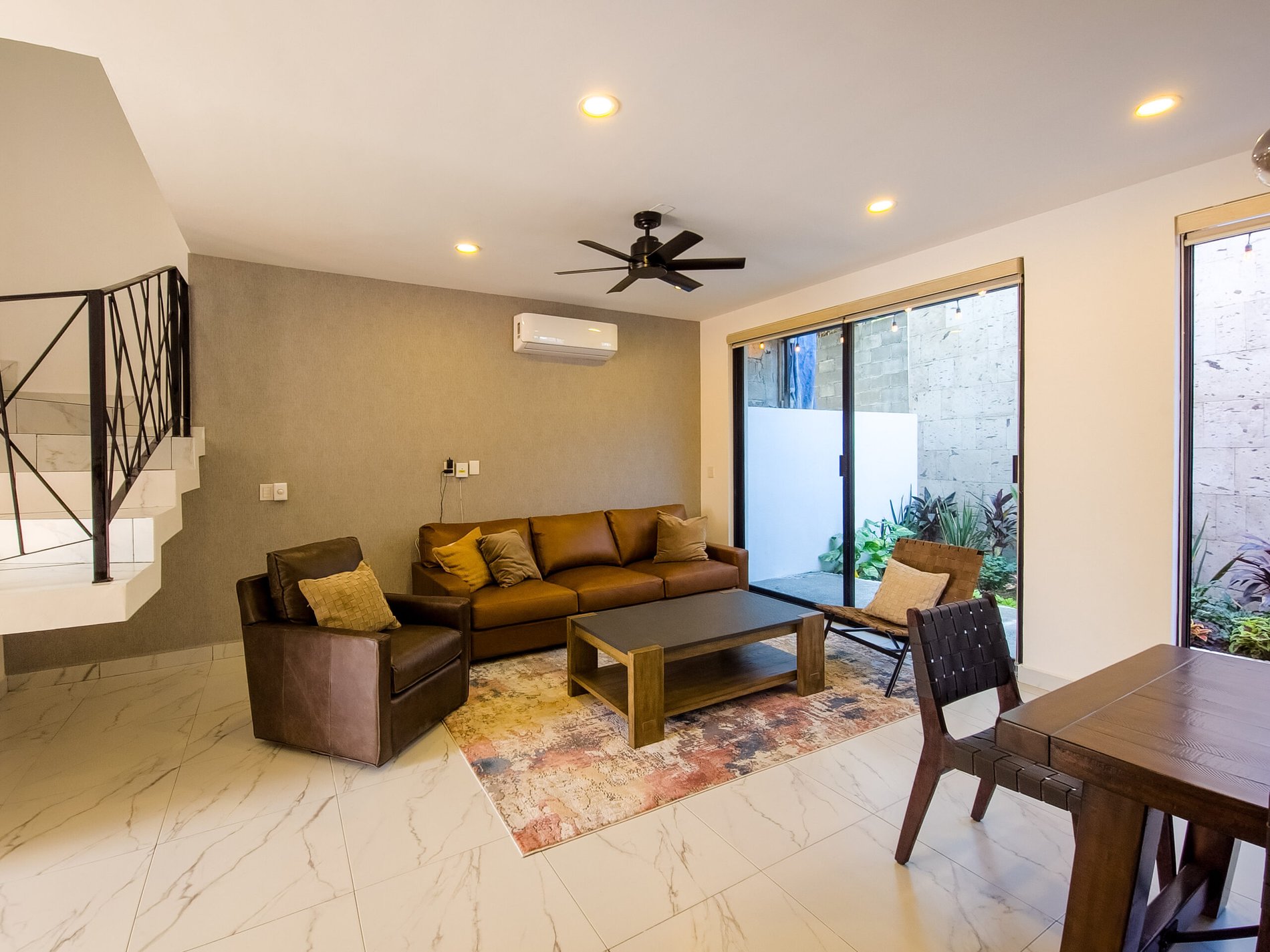 Comfortable living room with air conditioning and wooden dining room with 6 chairs.