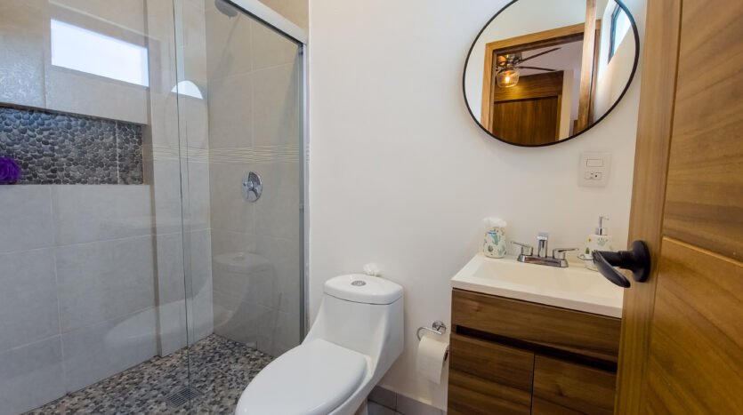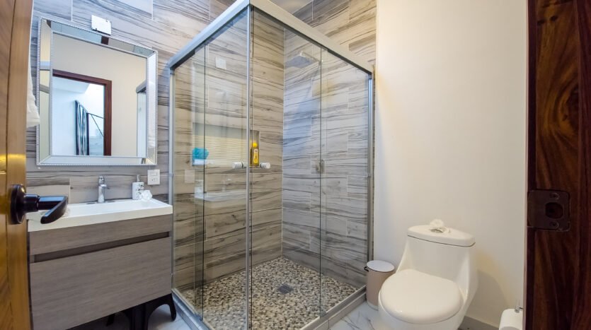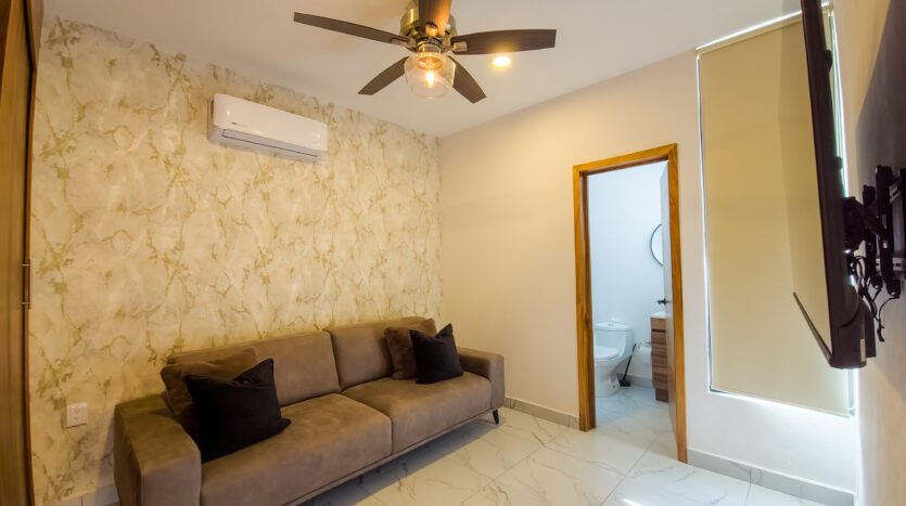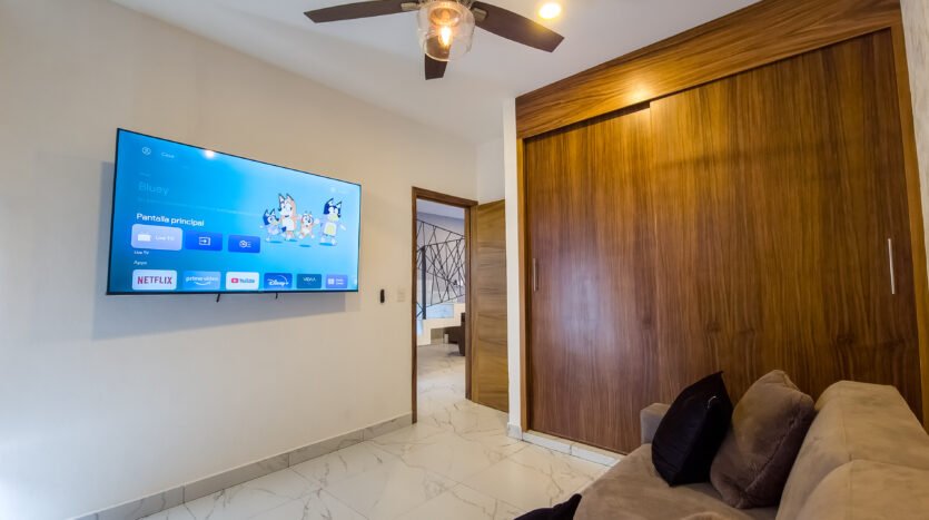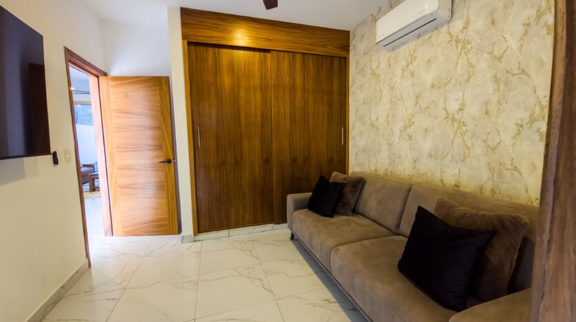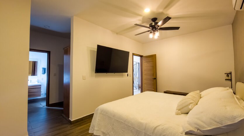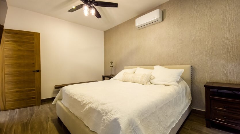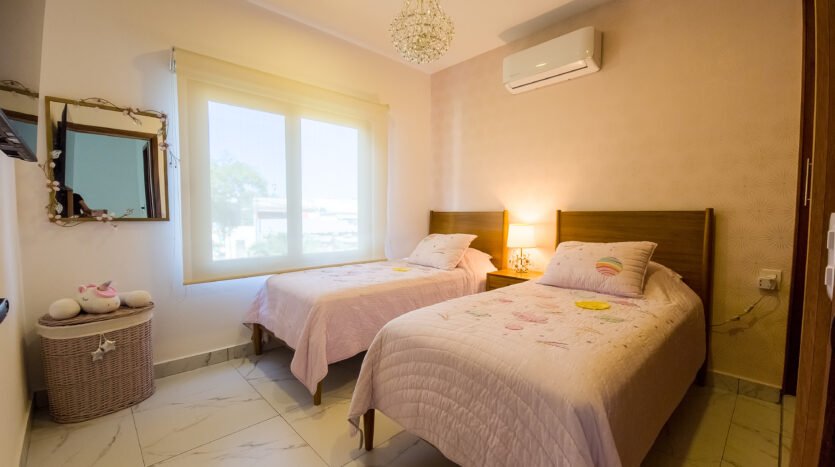 The master bedroom is very spacious and elegant, has a king size bed, TV, walking closet and full bathroom, while the two secondary bedrooms have closets, the first has a double bed and the second has two single beds, both sharing a full bathroom, providing a perfect balance between privacy and family connectivity.