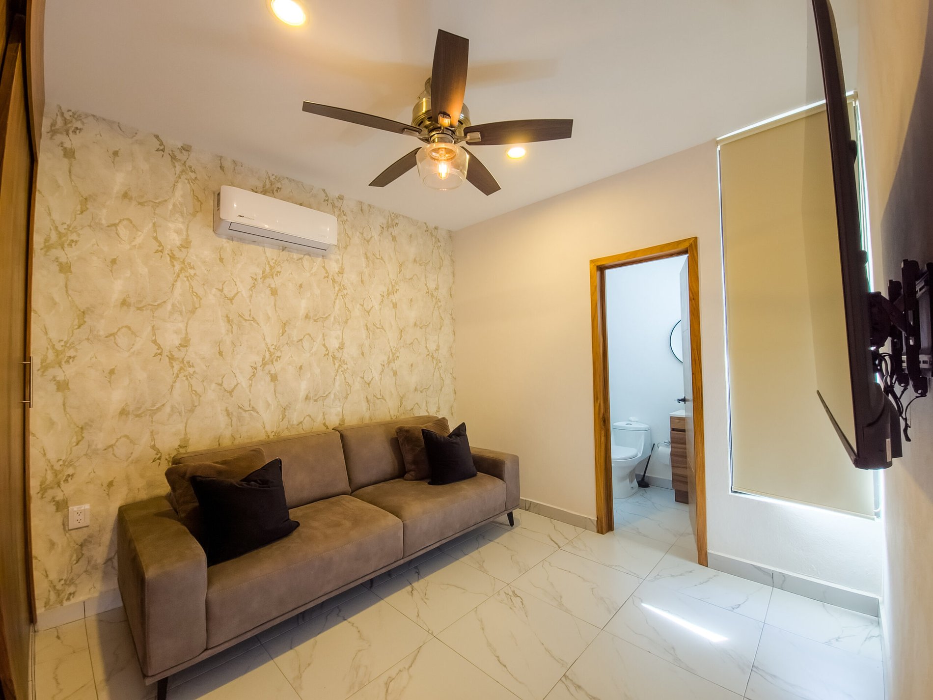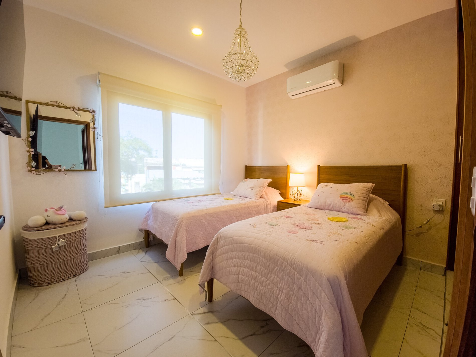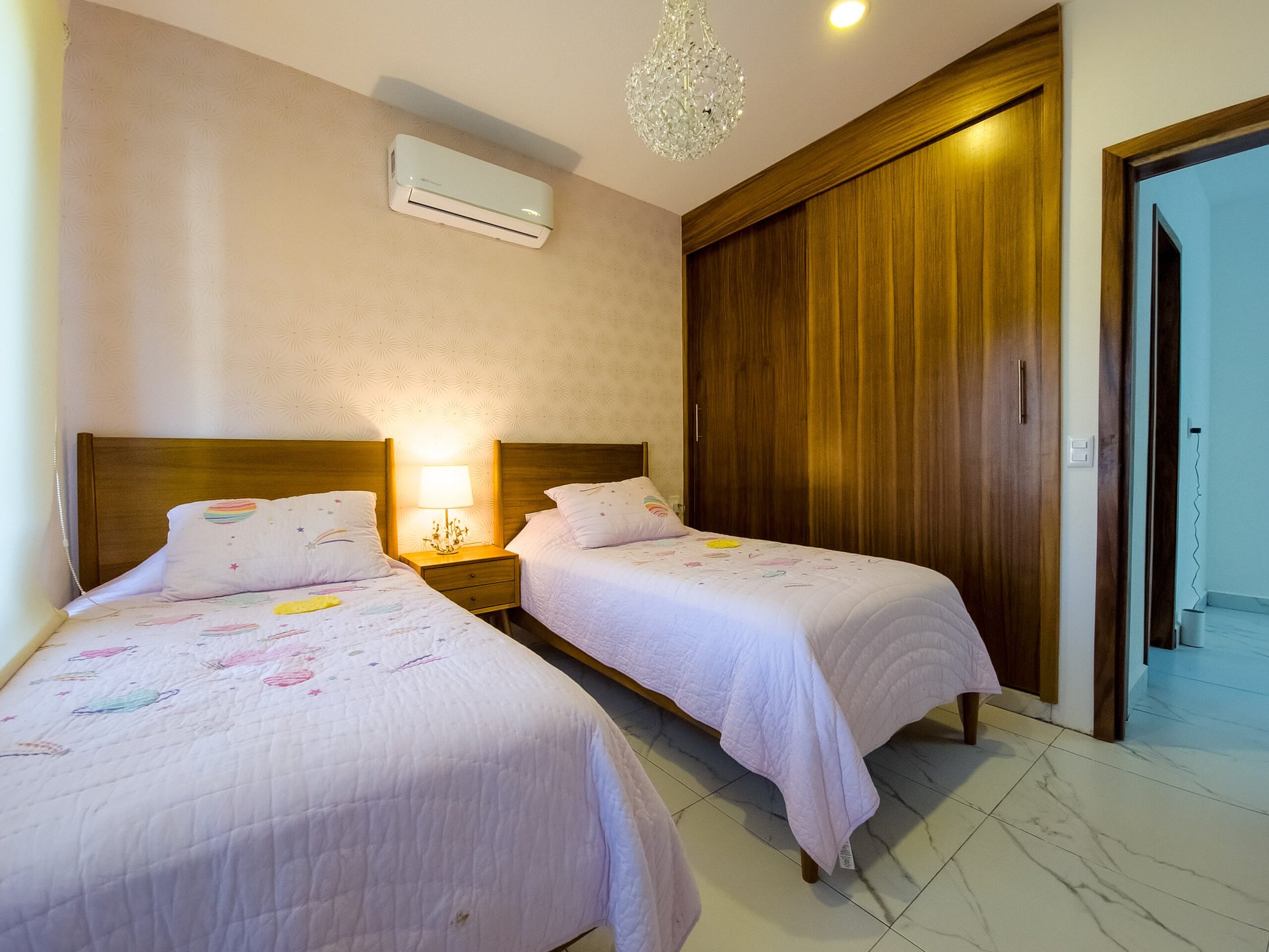 The master bedroom is very spacious and elegant, has a king size bed, TV, walking closet and full bathroom, while the two secondary bedrooms have closets, the first has a double bed and the second has two single beds, both sharing a full bathroom, providing a perfect balance between privacy and family connectivity.