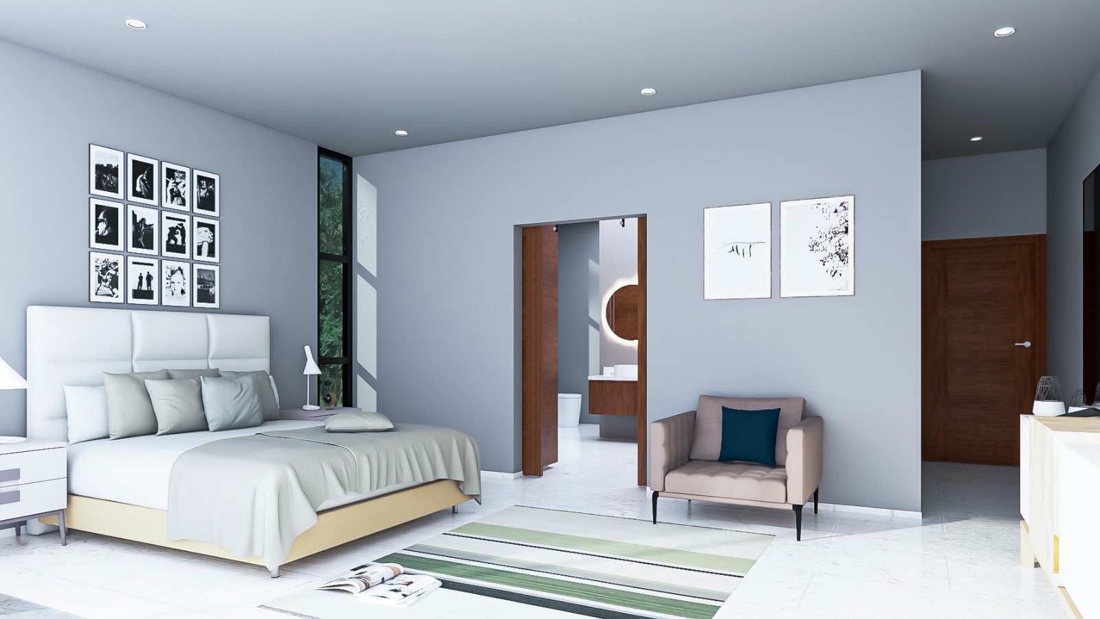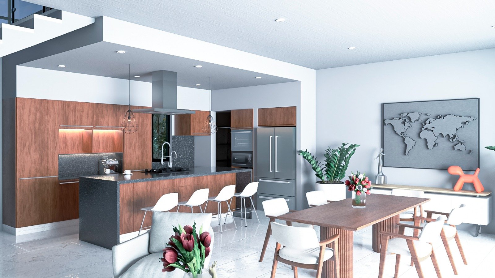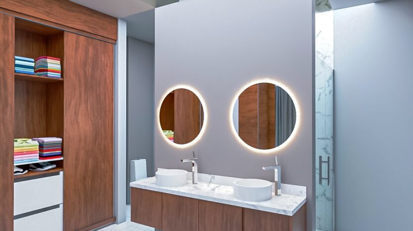 The kitchen, designed as the heart of the home, will be delivered fully equipped with cooktop, oven, microwave, range hood, sink, and dishwasher. A central island with natural stone countertop and parota wood cabinetry blends functionality with contemporary design.