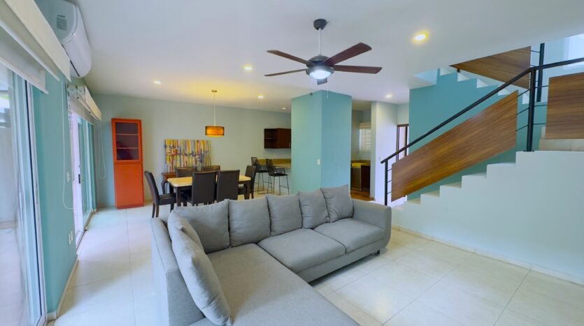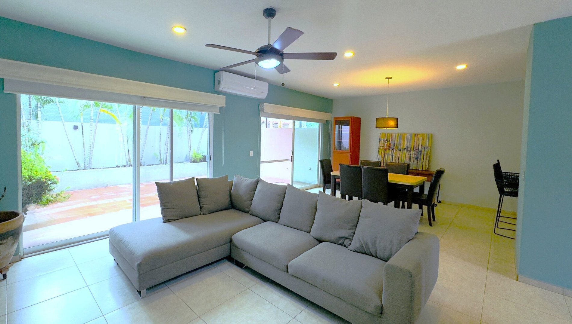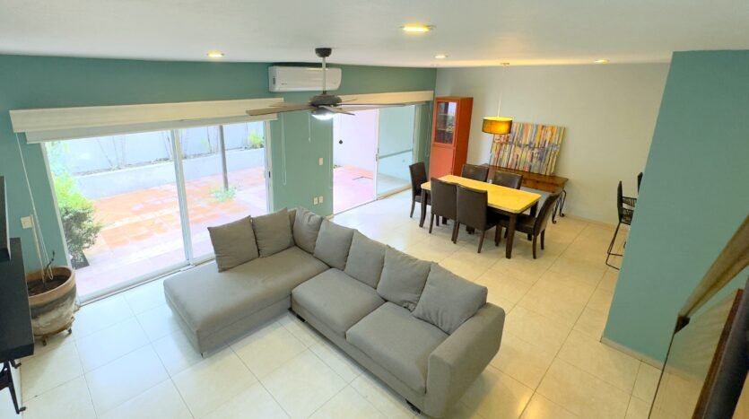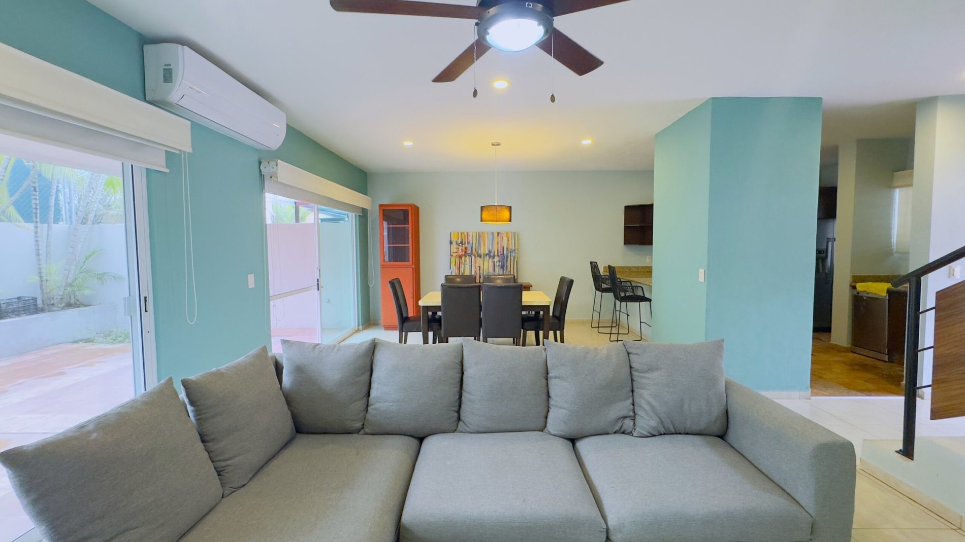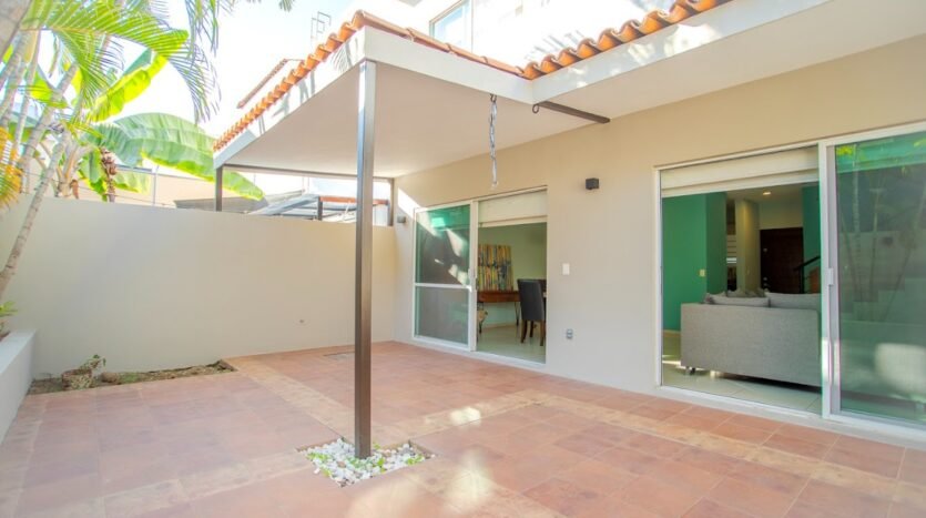 El patio trasero es uno de los principales atractivos de la propiedad, ya que cuenta con terraza, jardineras y techo parcial, perfecto para acondicionar un área social exterior, zona de descanso o asador. La planta baja dispone además de aire acondicionado y ventilador de techo para mayor confort.