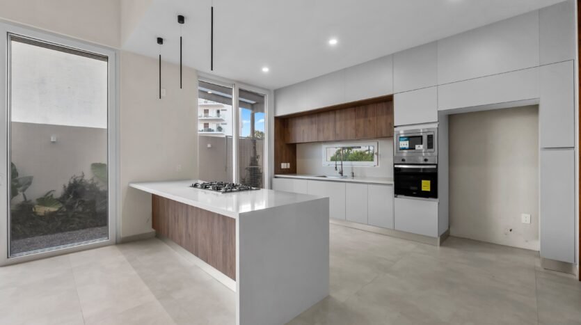 – Planta baja: incluye una recámara con baño completo, sala de doble altura con medio baño y cocina moderna con isla y vista al jardín.