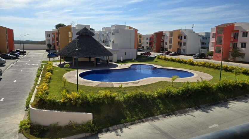 Descubre este departamento en renta en Ecoterra Vallarta, ubicado en segundo piso y con vista directa a la alberca y áreas verdes, justo frente a las amenidades del fraccionamiento.