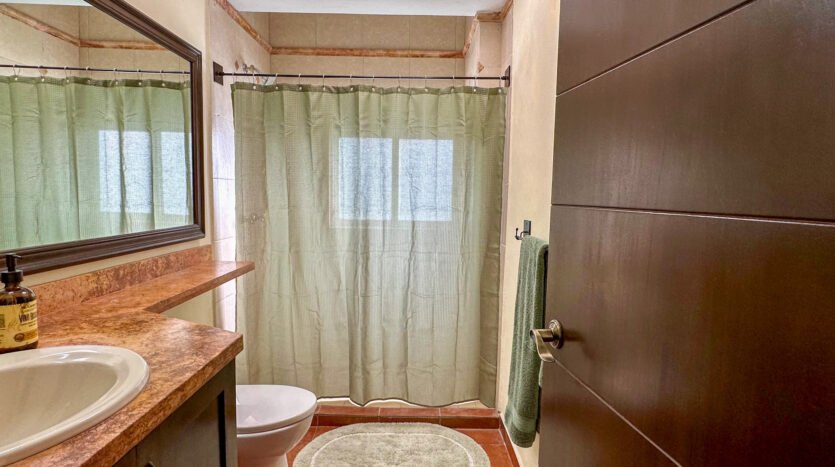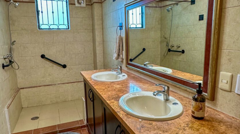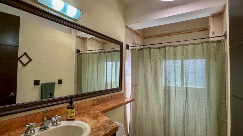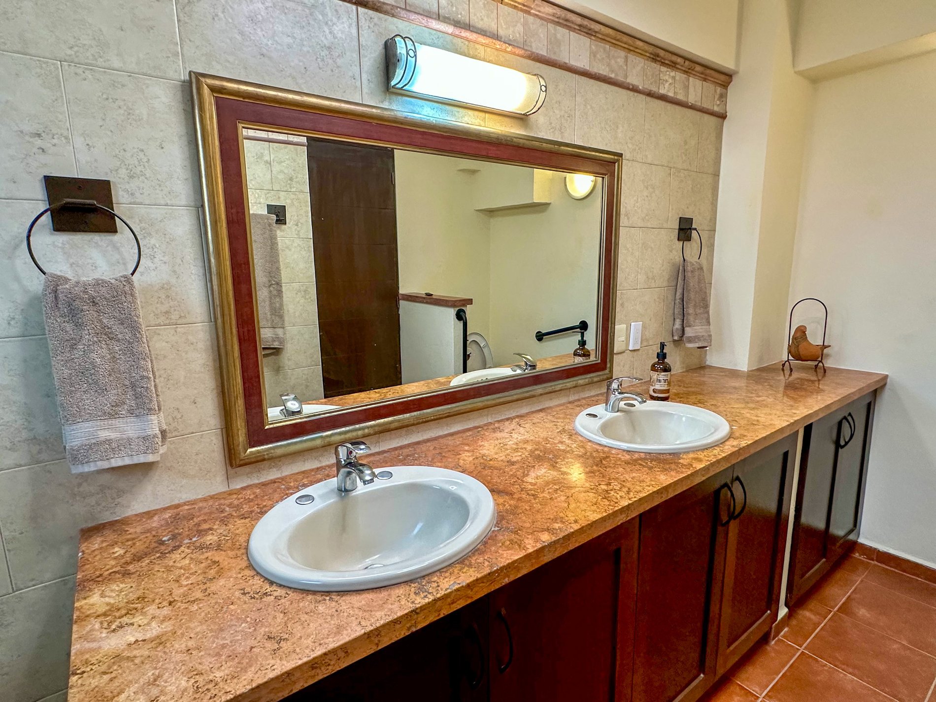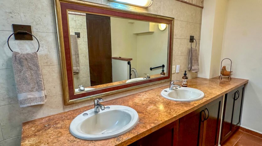 El dormitorio principal está conectado al balcón, cuenta con clóset amplio y muebles de madera de parota. Tiene su propio baño independiente con doble lavabo de mármol y regadera grande.